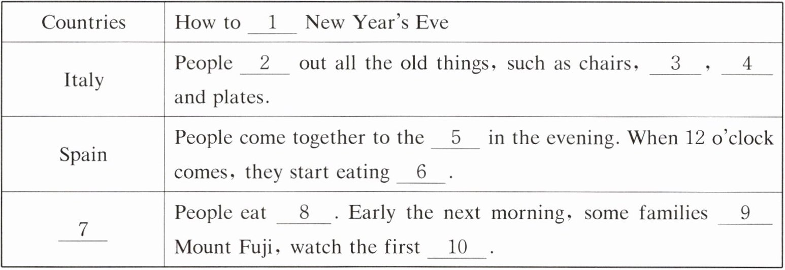 | 7 | People eat 8 . Early the next morning, some families 9 Mount Fuji, watch the first 10 . |