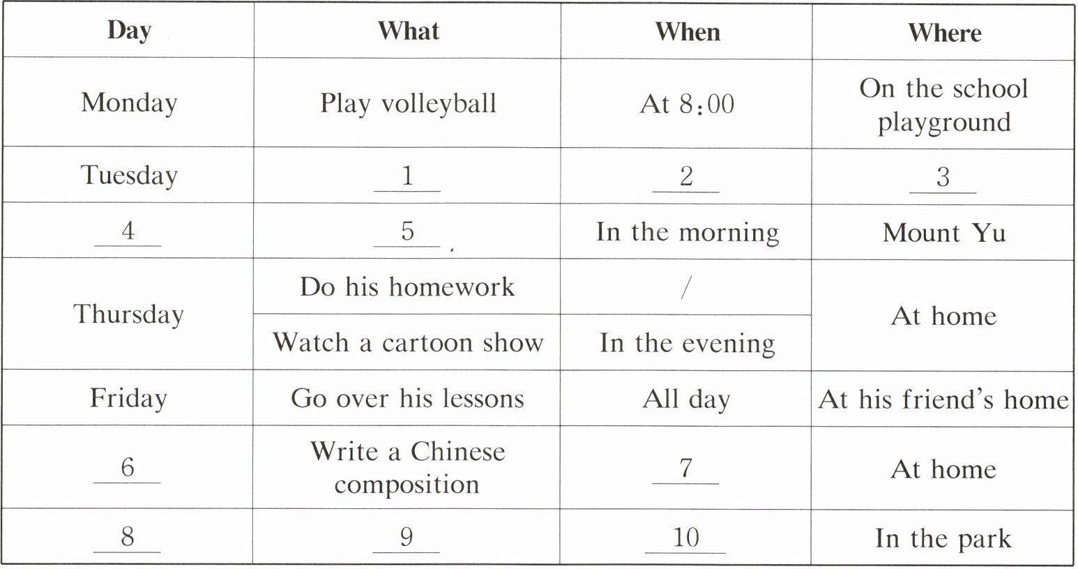 阅读短文,用恰当的词完成下面的表格,每空词数不超4个词。