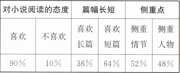 ① 全班同学九成喜欢阅读小说;② 多数同学喜欢阅读短篇小说;③ 在情节和人物的侧重上基本持平。
