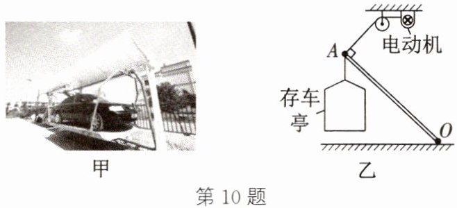 10. (2024·淄博沂源二模)如今大城市普遍存在着停车难的问题,图甲是集存车、绿化、景观、防盗、户外广告等多功能为一体的“路边空中绿化存车亭”。图乙为“路边空中绿化存车亭”的工作原理图。$O$为转动轴,存车亭固定在$A$端,电动机借助定滑轮用绳将杆拉起。如果不考虑杆的重力和机械各部分的摩擦力,小汽车从水平地面被提升到如图乙所示的位置,作用在$A$点的动力将 (
