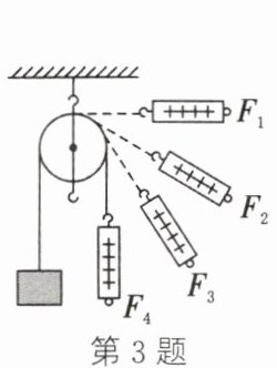 3. (2024·南通崇川校级段考)如图所示,一根绳子绕过定滑轮,一端拴在物体上,另一端拴在弹簧测力计上,沿四个不同方向匀速拉起物体,弹簧测力计的示数分别为$F_1$、$F_2$、$F_3$、$F_4$,则$F_1$、$F_2$、$F_3$、$F_4$的大小关系为 (