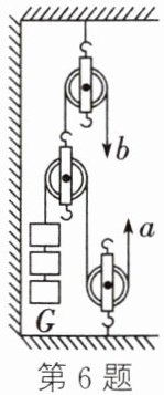 6. 小明去健身房用如图所示的牵引装置来锻炼腿部和手部肌肉。使用时,若绳a处固定不动,手在b处需用力$F_{b}$拉绳,使重物G匀速上升;若绳b处固定不动,腿在a处需用力$F_{a}$拉绳,使重物G匀速上升。不计绳重和摩擦,则 (