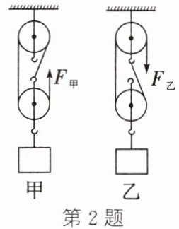 2. 如图所示,用甲、乙两滑轮组匀速向上提升重物,物重都是600 N,若不计绳重、动滑轮重及摩擦,则拉力$F_{甲}=$