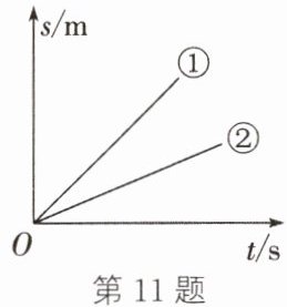 11. 小明用弹簧测力计两次沿水平方向拉着同一物体在同一水平面上做直线运动,两次运动的s-t图像如图中①②所示。其对应的弹簧测力计示数分别为$F_1$、$F_2$,相等时间内所做的功分别为$W_1$、$W_2$,则它们的关系正确的是 (