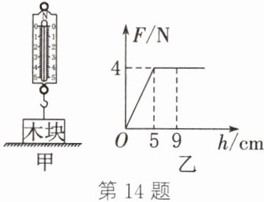 14. 小明在测量木块重力时,将木块通过细绳挂在弹簧测力计下,从图甲所示位置开始竖直向上缓慢提升弹簧测力计,弹簧测力计的示数F与弹簧测力计上升高度h之间的关系如图乙所示。木块的重力大小为