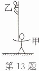 13. 杂技“顶竿”表演如图,甲站在地面上,肩上顶着一根重力$G_1= 50\ N$的竖直竹竿,重力$G_2= 550\ N$的乙沿竹竿匀速上爬4 m,然后甲顶着乙在水平地面上缓慢直立行走2 m。在此过程中,求: