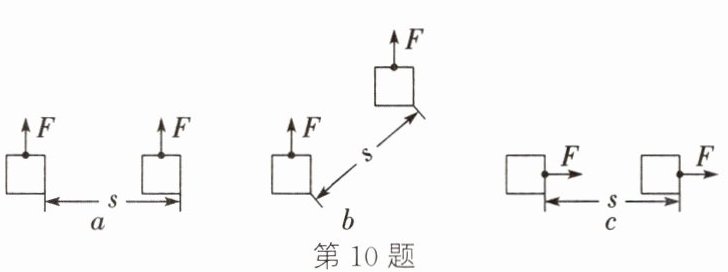 10. (易错题)(2024·南京秦淮校级段考)如图所示,a、b、c三种情况下,用大小相同的力F使同一物体沿不同的轨迹移动了相同的距离s,对于三种情况下拉力F所做功的分析正确的是 (