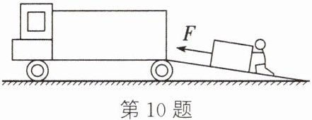10. 如图所示,工人在往车上搬运箱子时,先用3m长的木板搭了一个斜面,再用500N的推力把120kg的箱子沿斜面匀速推到1m高的车厢上,用时10s。g取10N/kg。