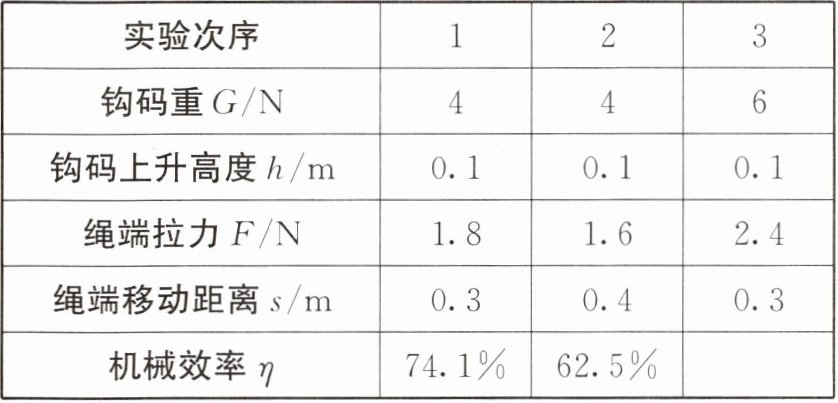 | 实验次序 | 钩码重$G$/N | 钩码上升高度$h$/m | 绳端拉力$F$/N | 绳端移动距离$s$/m | 机械效率$η$ |