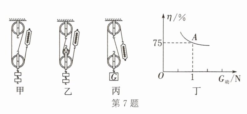 9. 甲、乙两滑轮组均由一个定滑轮和一个动滑轮组成,用两滑轮组分别提升同一重物时,不计绳重和摩擦,机械效率分别为$η_{甲} = 80\%$,$η_{乙} = 75\%$。两滑轮组中动滑轮的重力$G_{甲} : G_{乙}$为 (