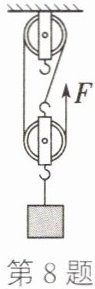 8. 用如图所示的滑轮组提升重物。某人用100 N的拉力$F$,30 s内使重为180 N的物体匀速上升了6 m。