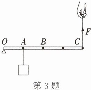 3. 如图所示为一根均匀的细木棒OC,$OA = \frac{1}{4}OC$,B为OC的中点。小明在C点施加始终竖直向上的拉力F将挂在A点的重为180 N的物体匀速提升0.2 m,细木棒的机械效率为90%,不计摩擦和绳子重。求: