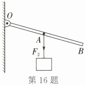 16. 图中,用直棒提升重物,画出图示位置所用最小力$F_1和阻力F_2的力臂l_2$。