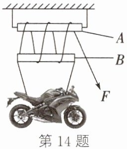 14. 一种利用滚轴和绳子组装的特殊机械如图,借助这种机械可以将较重的物体搬运到高处,某人借助该机械吊起一辆摩托车。不计绳和机械自重,下列说法错误的是 (