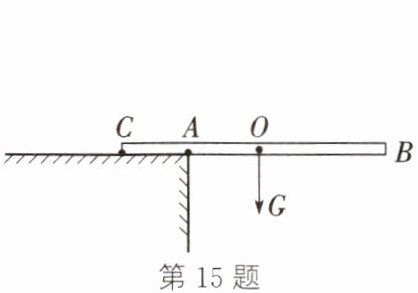 15. 如图所示,有一根质量分布均匀的金属棒$CB$,现将$AC$部分搭在水平桌面上,已知金属棒长为$L$、重为$300\ N$,$CA:AB = 1:3$,为使金属棒保持图示位置静止,则在