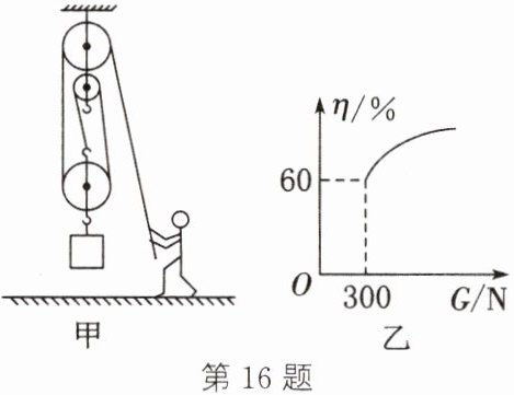 16. (2024·南通启东校级段考)质量为55kg的工人用如图甲所示的滑轮组运送货物上楼,滑轮组的机械效率随货物重力变化的图像如图乙所示。(摩擦力及绳重忽略不计,g取10N/kg)