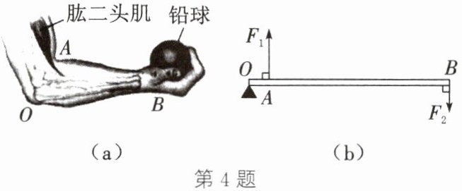 4. 前臂平伸用手掌托住铅球时的情形如图(a)所示。我们可将图(a)简化成如图(b)所示的杠杆,不计自重。若铅球质量$m = 3 kg$, $OA = 0.03 m$, $OB = 0.30 m$, 求此时肱二头肌对前臂产生的拉力$F_1$的大小。($g$取10N/kg)