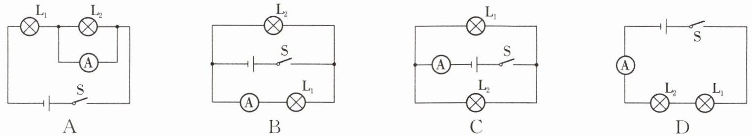 6. 下列电路中,闭合开关后,电流表能正确测量出通过 $L_2$ 的电流的是 (