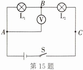 15. 某同学在利用电压表测用电器两端电压时,设计了如图所示的电路。当电压表的接线柱接$A$接线柱时,可以测出灯$L_1$两端的电压,如果其他元件不变,把电压表的此接线柱改接到$C接线柱上即可测出L_2$两端的电压,这样就可以省掉拆电路的麻烦。你认为这样做