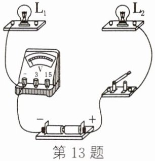 13. 在如图所示的实物电路中,有两根导线尚未连接,用笔画线代替导线将电路连接完整。要求:两灯串联,电压表只测灯$L_1$两端的电压,导线不能交叉。