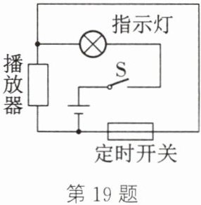 19. 一种定时课间音乐播放装置的原理图如图所示,“播放器”是有电流通过时会播放音乐的装置;“定时开关”是到达设定时间自动断开的开关。闭合开关S,当“定时开关”处于闭合状态时,指示灯 ①(会/不会)亮,播放器 ②(会/不会)播放音乐;到达设定时间“定时开关”处于 ③(闭合/断开)状态,“播放器”播放音乐。关于①②③处应填的内容,下列选项中正确的是(
