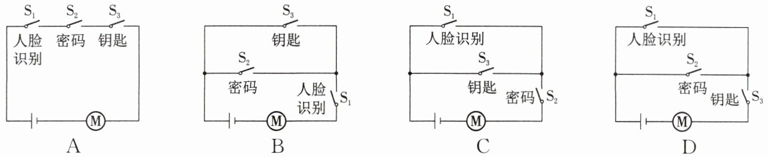 22. (2025·孝感汉川校级模拟)科技小组模拟“智能开锁”设计的电路图,有两种开锁方式,即“人脸识别”与输入“密码”匹配成功,或“人脸识别”与使用“钥匙”匹配成功才可开锁。现用$S_1$表示人脸识别,$S_2$、$S_3$表示密码、钥匙。匹配成功后对应开关自动闭合,电动机才工作开锁。满足上述两种方式都能开锁的电路是(