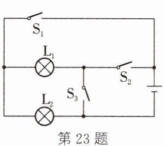 23. 如图所示电路,要使灯泡$L_2$发光、$L_1$不发光,应只闭合开关$S_2$;要使灯泡$L_1$、$L_2$并联,应闭合开关$S_1$、$S_3$;为了电路安全,不允许同时闭合开关$S_1$、$S_2$。