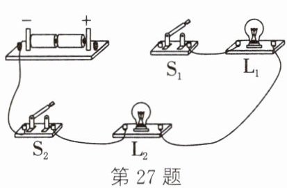 27. 将图中电路连接完整,要求:灯$L_1和灯L_2$并联,开关S1只控制灯$L_1$,开关$S_2同时控制灯L_1和灯L_2$。