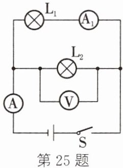 25. 如图所示,电源电压为3V,闭合开关S后,电流表A的示数为0.54A,电流表$A_1$的示数为0.2A,则通过小灯泡$L_1$的电流为