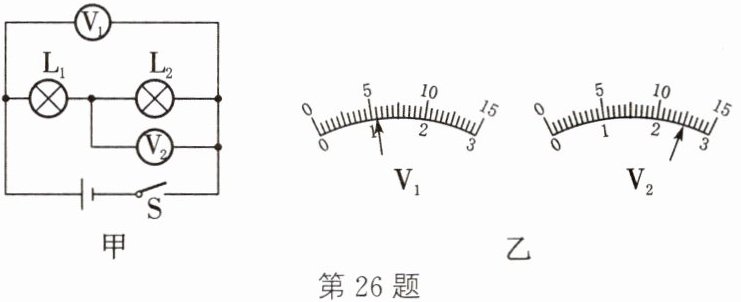 26. 如图甲所示的电路中,当电路闭合后,$V_1和V_2$的示数分别如图乙所示,则$V_1$的示数为5.5V,$V_2$的示数为2.5V,小灯泡$L_1两端的电压U_1 = $3V。
