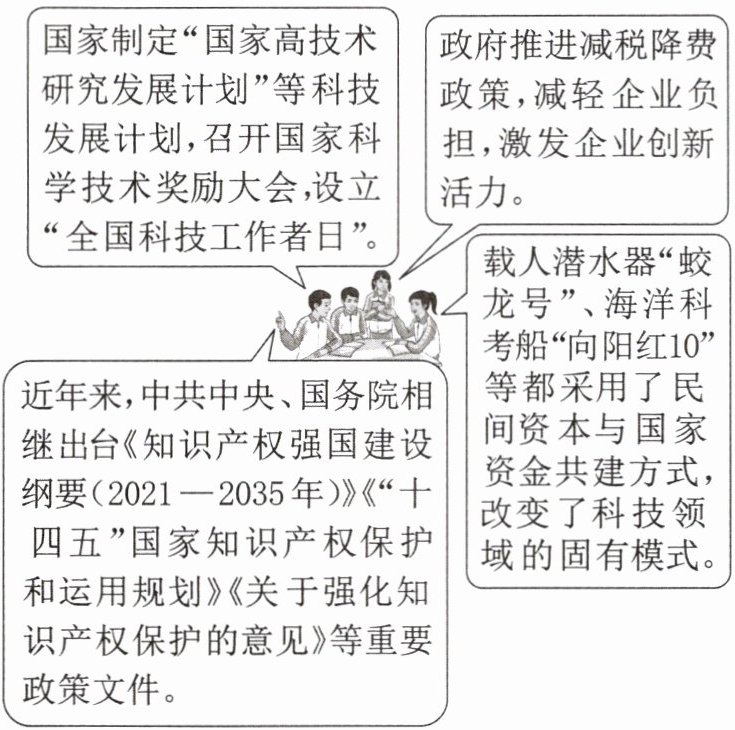 (1)①国家实施科教兴国战略、人才强国战略和创新驱动发展战略,制定科技发展计划,重视科技人才,为科技发展提供战略支持和精神激励。②政府通过减税降费等政策,鼓励企业创新,激发企业活力,发挥企业在创新中的主体作用。③鼓励社会资本参与科技领域建设,形成多元化的科技投入和发展模式,推动科技进步。