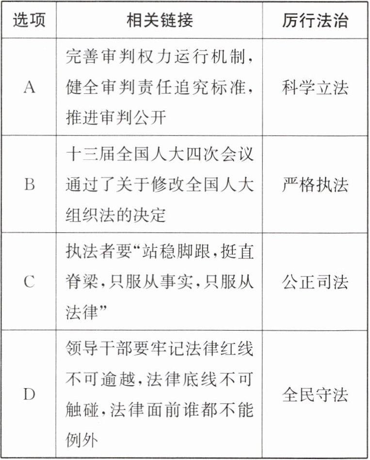 【解析】:本题可根据厉行法治的四个基本要求(科学立法、严格执法、公正司法、全民守法)的内涵,对各选项中的相关链接进行分析判断。