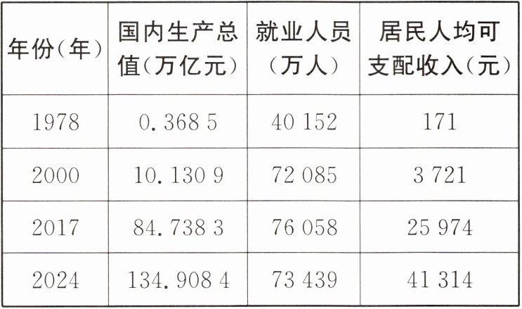 (1)①我国国内生产总值大幅增长,说明我国经济快速发展,综合国力显著增强。②就业人员数量有变化,反映了我国就业情况随着经济社会发展在不断调整。③居民人均可支配收入大幅增加,表明人民生活水平显著提高。