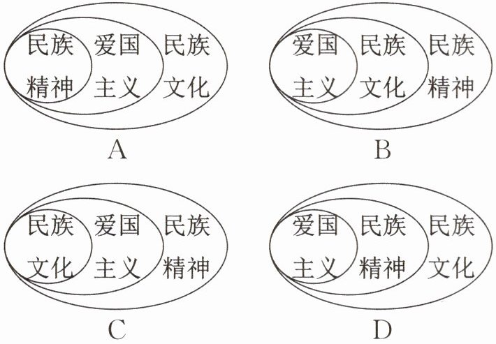 C选项,民族文化包含爱国主义,爱国主义包含民族精神,关系错误,故C选项错误。
