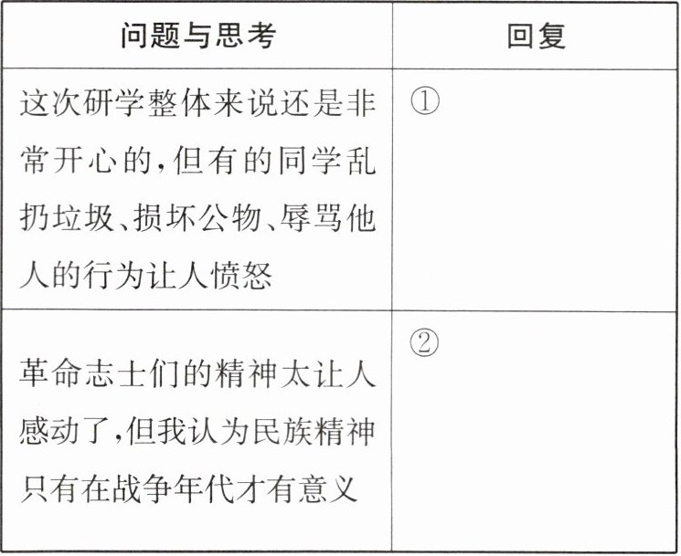 (3)①这些行为是不文明、不道德的,违背了社会公德,我们应自觉遵守公共秩序,爱护公共财物,尊重他人,做到文明研学;②这种观点是错误的。民族精神是中华民族生生不息、发展壮大的强大精神支柱,在和平年代,它激励着我们攻坚克难、开拓创新,为实现中华民族伟大复兴的中国梦而奋斗,同样具有重要意义。