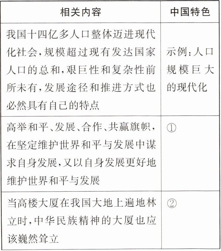 (1)请结合中国式现代化的“中国特色”,参照示例,完成上面表格。