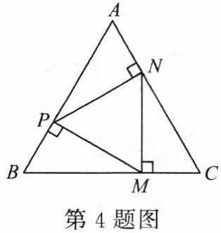 4. 如图,点P,M,N分别在等边△ABC的各边上,且MP⊥AB于点P,MN⊥BC于点M,PN⊥AC于点N。