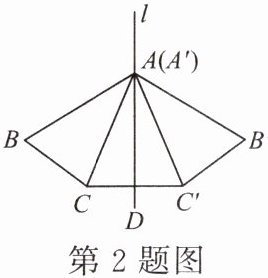 2. 如图,△ABC和△A′B′C′关于直线l对称,下列结论:①△ABC≌△A′B′C′;②∠BAC′= ∠B′AC;③l垂直平分CC′;④直线BC和B′C′的交点不一定在直线l上。其中正确的个数是( )。