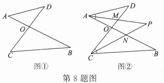 8. 图①,线段 $AB$,$CD$ 相交于点 $O$,连接 $AD$,$CB$,我们把形如图①的图形称为“$8$”字形。如图②,在图①的条件下,$\angle DAB和\angle BCD$的平分线 $AP$ 和 $CP$ 相交于点 $P$,并且与 $CD$,$AB$ 分别相交于点 $M$,$N$。试解答下列问题:
