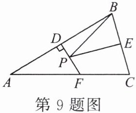 9. 如图,在 $\triangle ABC$ 中,$AB = AC$,$BC = 4$,$S_{\triangle ABC} = 12$,点 $D$,$E$ 分别是 $AB$,$BC$ 的中点,点 $F$ 在 $AC$ 上,且 $FD \perp AB$。若点 $P$ 为线段 $DF$ 上一动点,连接 $BP$,$EP$,则 $\triangle BPE$ 周长的最小值是 ______。