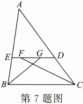 7. 如图,在 $\triangle ABC$ 中,$ED // BC$,$\angle ABC$ 和 $\angle ACB$ 的平分线分别交 $ED$ 于点 $G$,$F$,若 $FG = 4$,$ED = 8$,则 $EB + DC = $ ______。