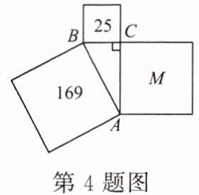 4. 如图,在$\mathrm{Rt}\triangle ABC$中,$\angle ACB = 90^{\circ}$,分别以$AB$,$BC$,$AC$为边向外作三个正方形,已知其中两个正方形面积分别为$25$,$169$,则正方形$M$的面积为( )。