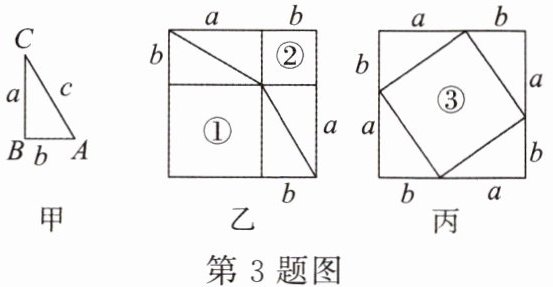 3. 图甲是任意一个直角三角形$ABC$,它的两条直角边长分别为$a$,$b$,斜边长为$c$。如图乙、丙分别取四个与直角三角形$ABC$全等的三角形,放在边长为$a + b$的正方形内。你能利用图乙和图丙验证勾股定理吗?说明理由。