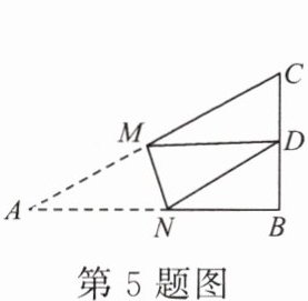 5. 如图,在$\mathrm{Rt}\triangle ABC$中,$AB = 9$,$BC = 6$,$\angle B = 90^{\circ}$,将$\triangle ABC$折叠,使$A点与BC的中点D$重合,折痕为$MN$,则线段$BN$的长为____。