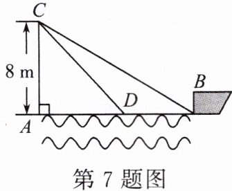 7. 如图,在离水面高度为$8\mathrm{m}$的岸上,有人用绳子拉船靠岸,开始时绳子$BC的长为17\mathrm{m}$,此人以$1\mathrm{m}$每秒的速度收绳,$7\mathrm{s}后船移动到点D$的位置,则船向岸边移动了多少米(假设绳子是直的)?