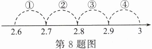 C 解析:因为$2.6^{2}=6.76$,$2.7^{2}=7.29$,$2.8^{2}=7.84$,$2.9^{2}=8.41$,$3^{2}=9$,且$7.84<8<8.41$,所以$2.8<\sqrt{8}<2.9$。所以表示$\sqrt{8}$的点落在范围③。