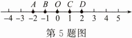 5. 如图,数轴上的点A,B,O,C,D分别表示数$-2$,$-1$,0,1,2,则表示数$2-\sqrt{5}$的点P应落在( )。
