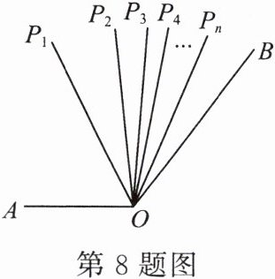 8. 如图,在$\angle AOB内部顺次有一组射线OP_{1}$,$OP_{2}$,…$$,$OP_{n}$,满足$\angle AOP_{1} = \frac{1}{2}\angle AOB$,$\angle P_{1}OP_{2} = \frac{1}{3}\angle P_{1}OB$,$\angle P_{2}OP_{3} = \frac{1}{4}\angle P_{2}OB$,…$$,$\angle P_{n - 1}OP_{n} = \frac{1}{n + 1}\angle P_{n - 1}OB$,若$\angle AOB = \alpha$,则$\angle P_{n}OB = $______(用含$n$,$\alpha$的代数式表示)。
