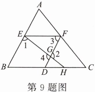 9. (17分)如图,$\angle 1 + \angle 2 = 180^{\circ}$,$\angle 3 = \angle B$。求证:$EF // BC$,请完成证明过程及理由填写。