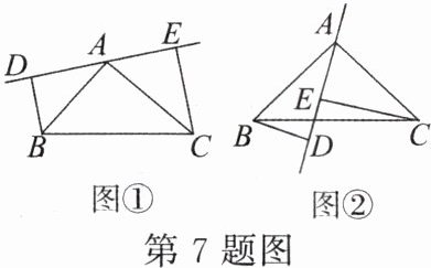 7. 如图,在△ABC中,AB= AC,DE是过点A的直线,BD⊥DE于点D,CE⊥DE于点E。